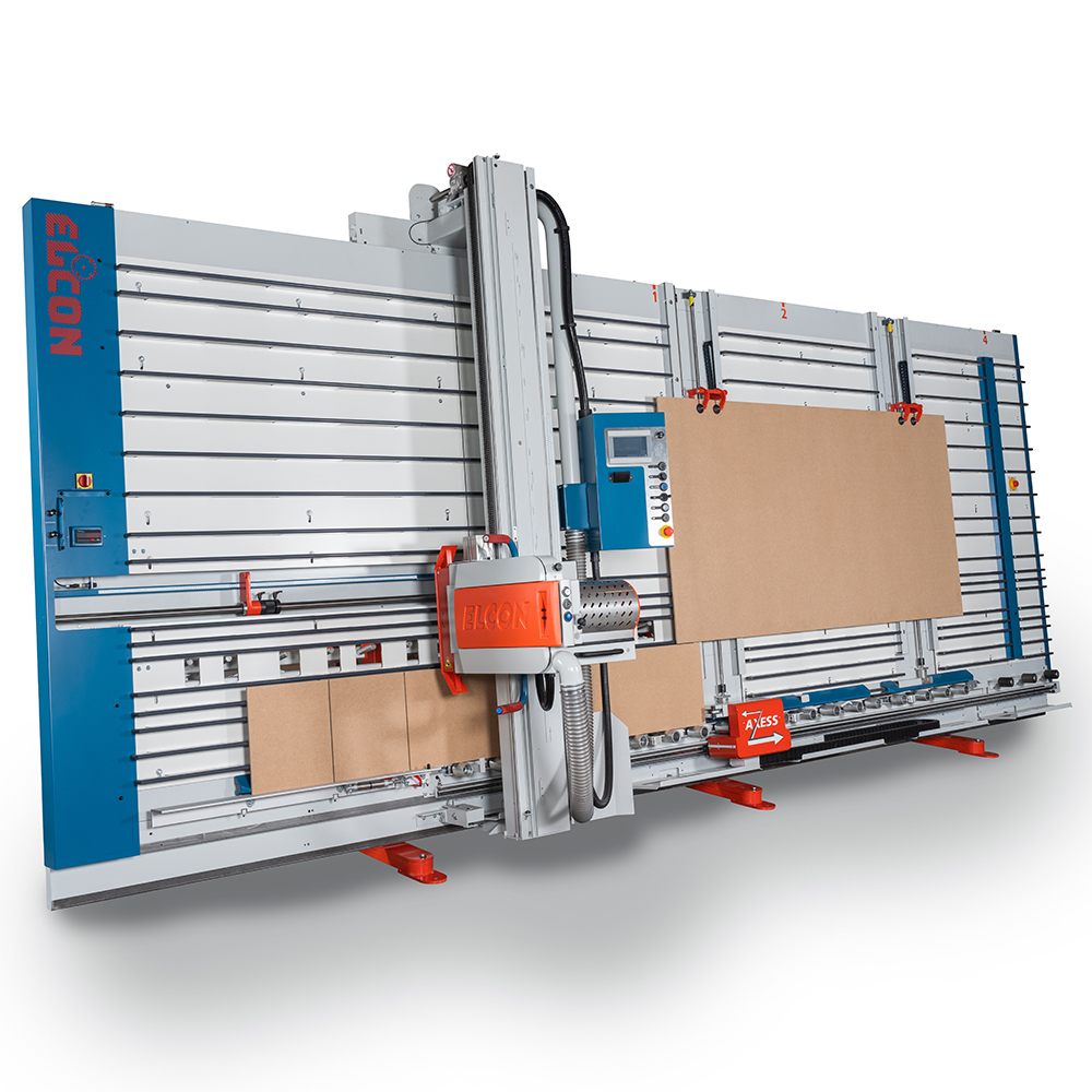The Elcon QUADRA vertical panel saw features the most advanced automatic cutting cycle available. All the cutting movements are carried out automatically, working from a pre-defined cutting list that can be entered manually at the machine, or remotely from an office based PC. Engaged by the touch of button the cutting speed can be adjusted from 0 – 20 m/min depending on the material being cut. The cutting height and length is also adjusted to the actual size of panel being cut.