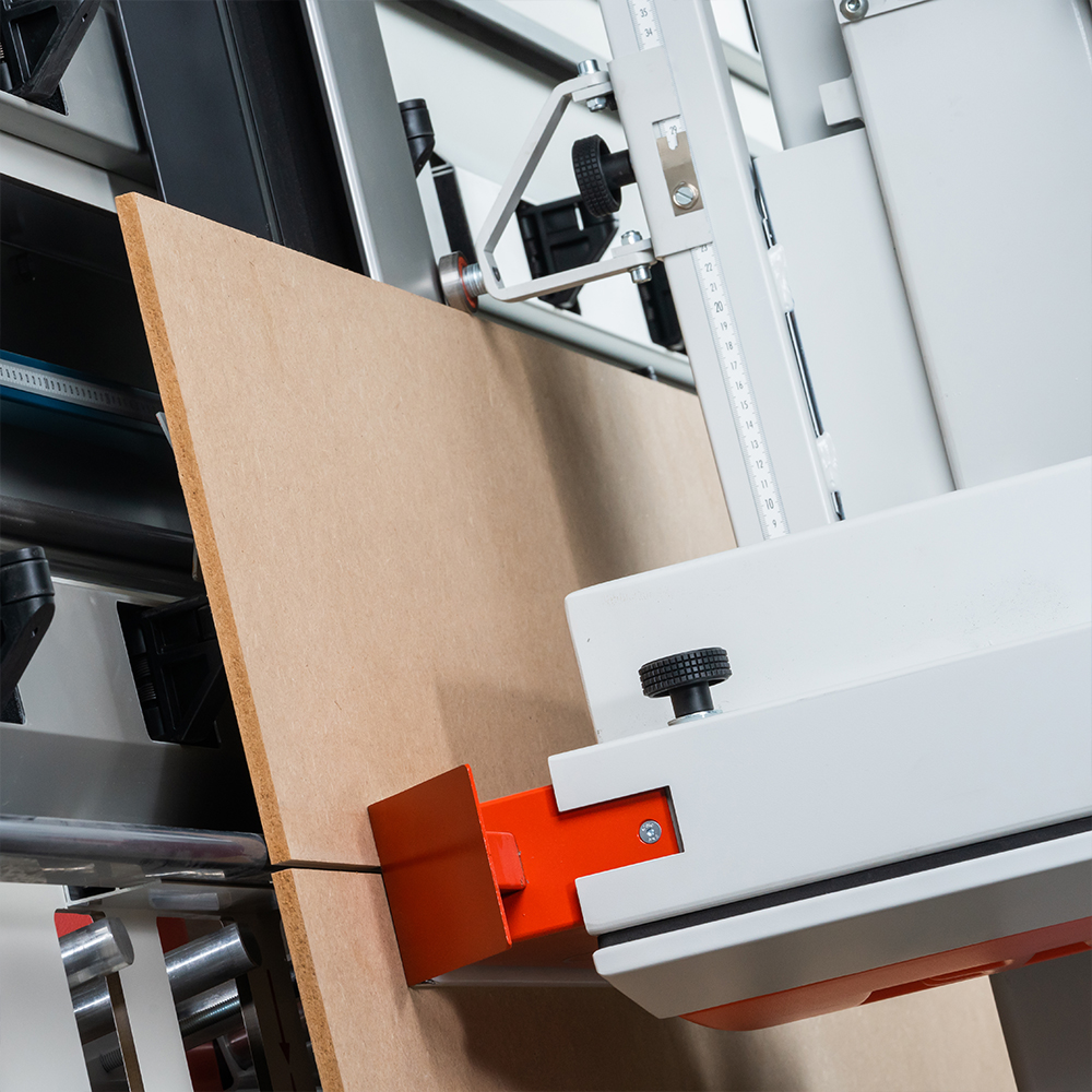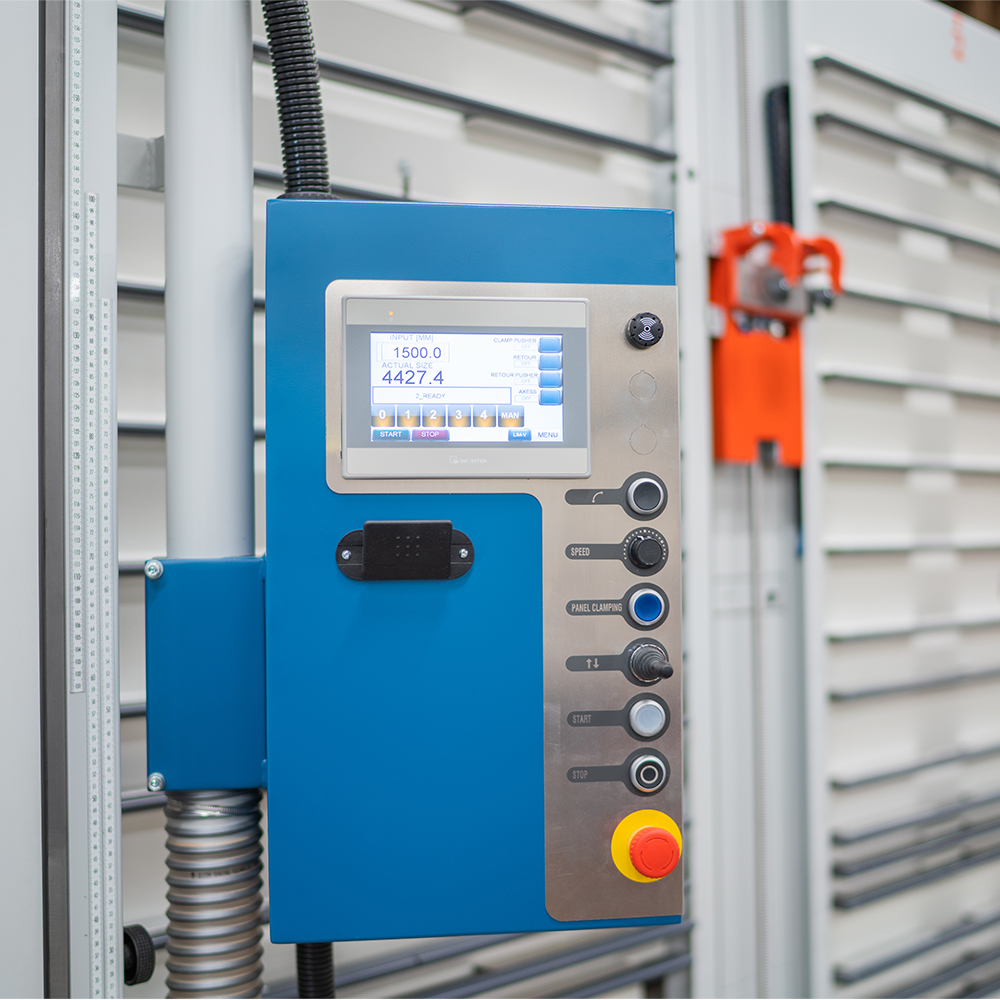 The DSX ADVNCE features a heavy duty flip down fence stop with fine adjustment providing a positive and robust datum for positioning panels when cutting vertically. The saw beam is locked into one of a series of positions (0, 1, 2 etc) and the fence stop adjusted. For example, when cutting 1300mm, the fence is positioned to 300mm and the saw beam locked at position 1, for 2300mm the fence remains positioned at 300mm and the saw beam locked into position 2.