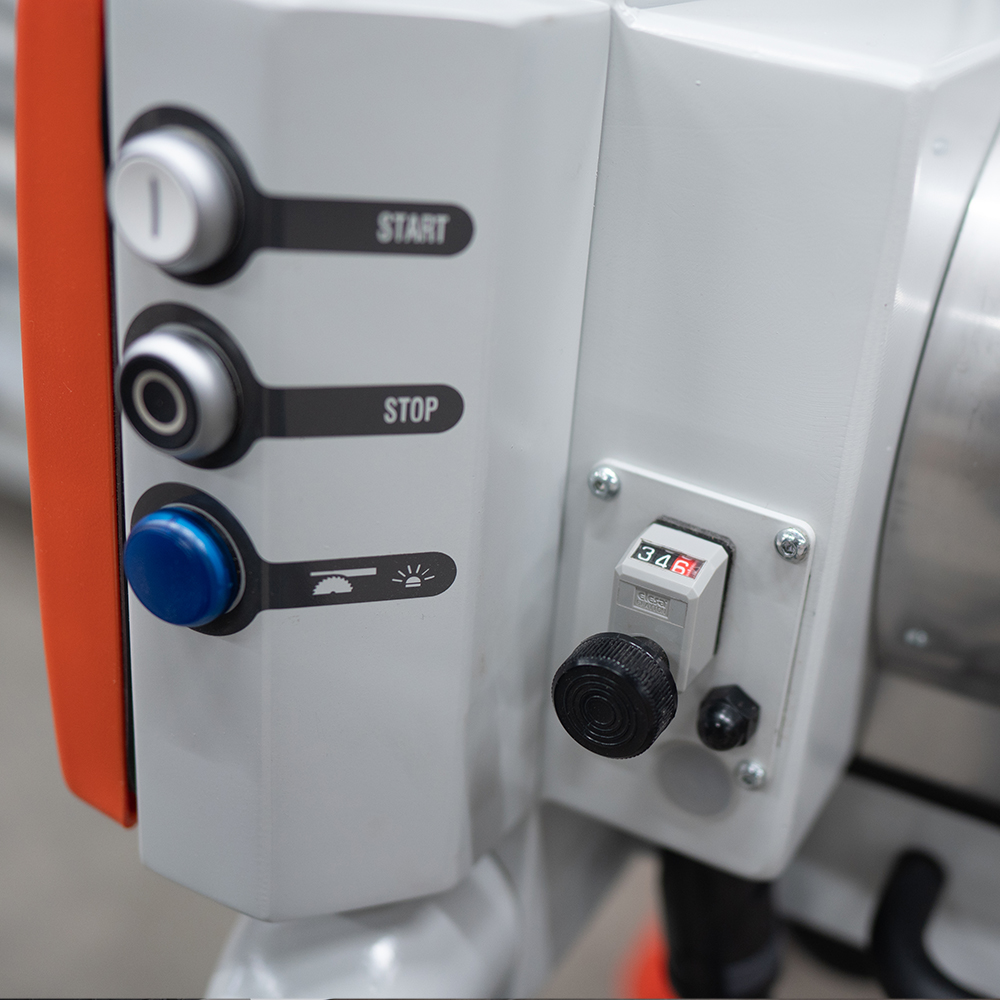 The optional electro-pneumatic scoring system is a popular additional on the QUADRA model. When working with faced material, laminated and veneered board the double cut scoring system can be used to avoid chipping and breakout. The system enables the operator to limit the depth of plunge on the main saw blade allowing a reverse cut to made, scoring the material, followed by a full plunge to cut right through the material resulting in a perfectly clean cut. The system can be engaged and disengaged from conveniently positioned push button on the plunge arm.