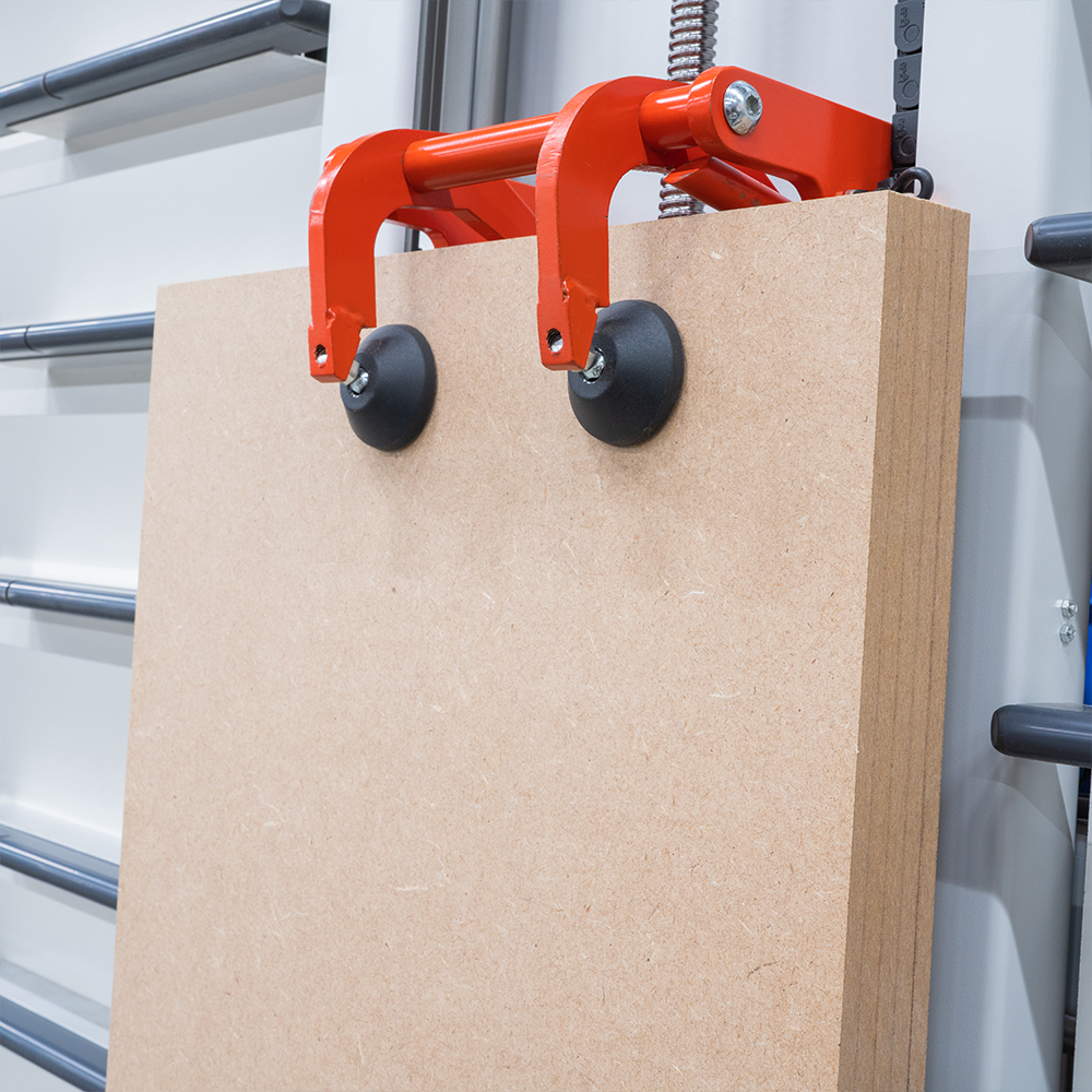 The QUADRA includes double bearing transport rollers as standard. Panels are loaded and glide into position with minimal effort. When cutting a pneumatic panel clamp secures the work piece to prevent it from moving.