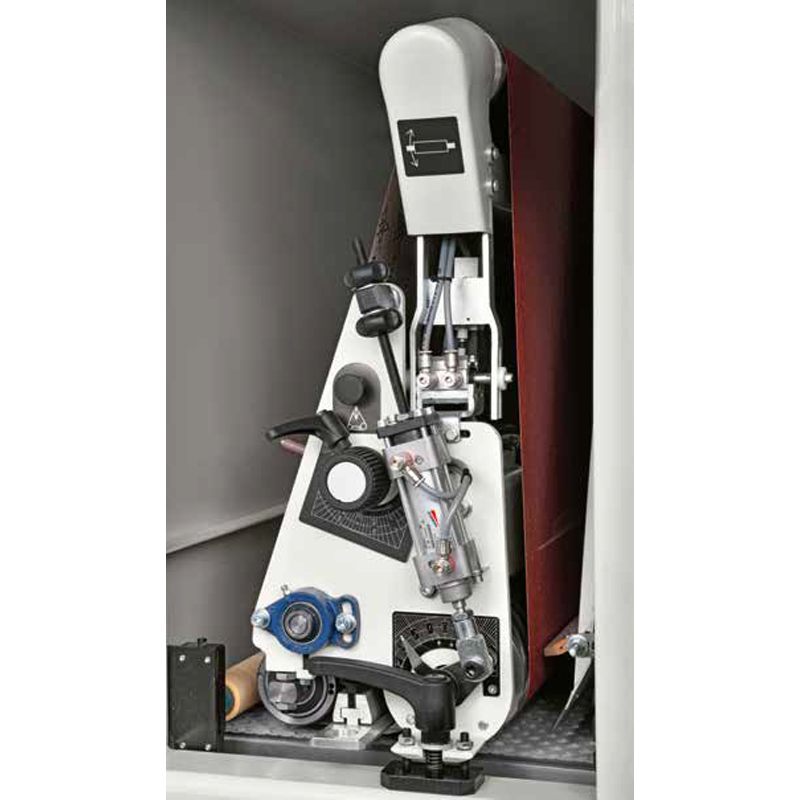 Setting is simple and intuitive with powered automatic table positioning; offer the workpiece up to the machine and it will detect the thickness and set itself accordingly. The feed belt is made from natural rubber with a diamond shaped tread for maximum traction. Floating rubber-covered pressure rollers positioned in front and behind the sanding head ensure the workpiece is secure throughout the sanding process.