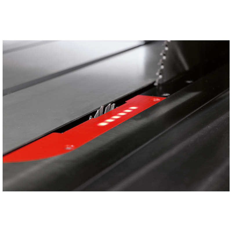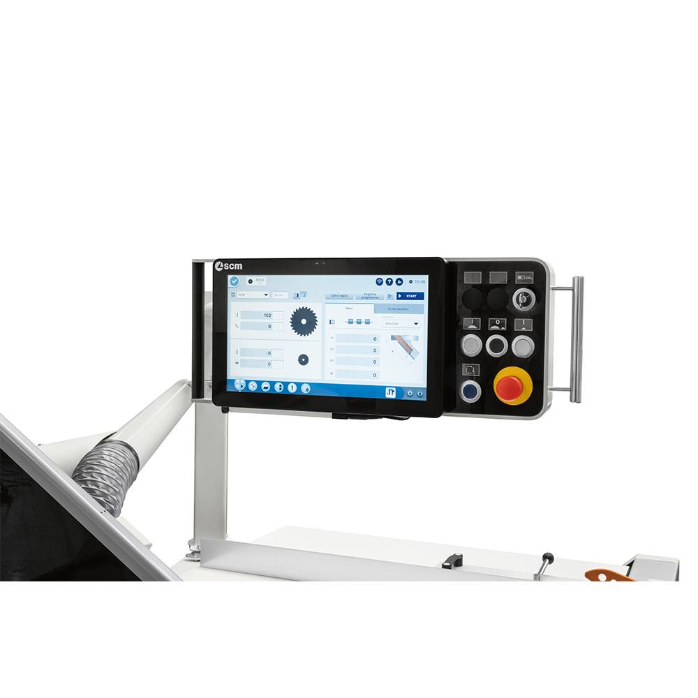 Operators will welcome the wealth of features that facilitate work with speed and accuracy. Start stop controls on the sliding table, powered rise, fall and tilt adjustment, powered CNC rip fence movement, independent scoring saw unit with separate powered 2 axis vertical and horizontal adjustment. At the sharp end, performance is delivered with a 550 mm diameter blade capacity giving a massive cutting depth of 200 mm with optional motor powers up to 11 Kw.