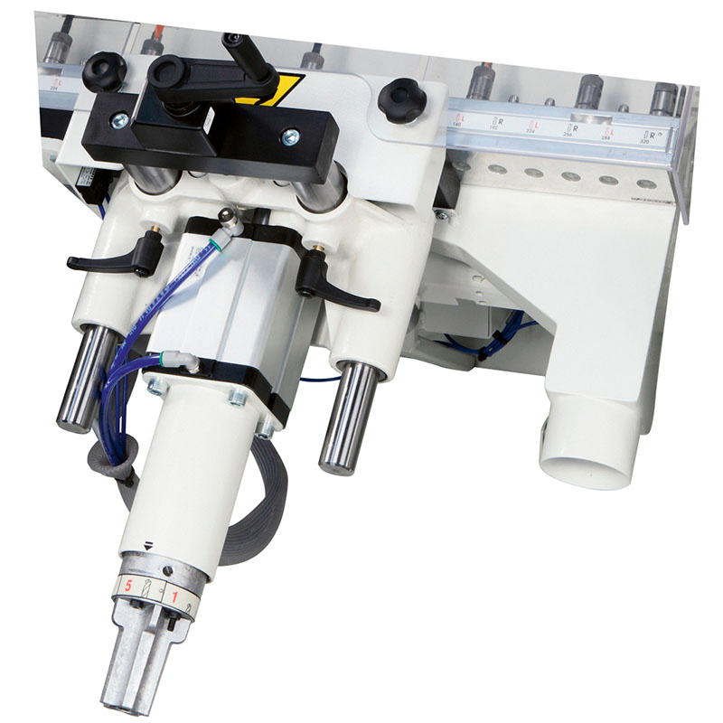 • Boring depth adjustment from 0 to 60 mm by means of 5 positions revolver WITH DEVICE TO AUTOMATICALLY CHANGE THE VERTICAL/HORIZONTAL DEPTH TO AVOID THE CHIPPING OF THE PANEL