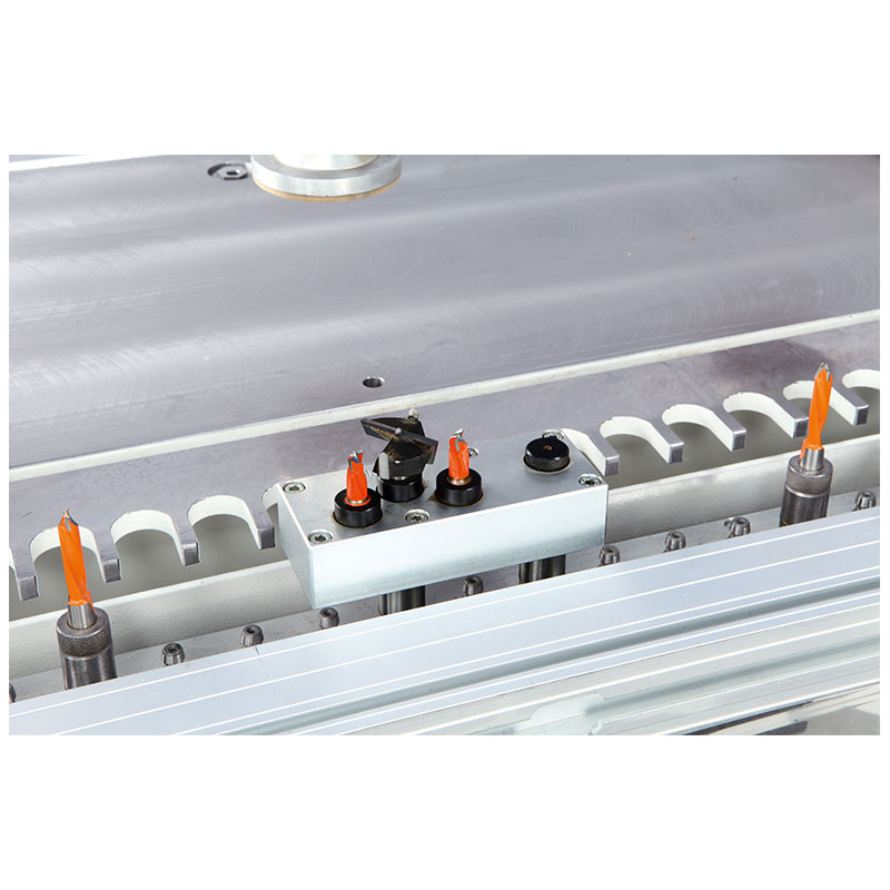 Single head multiple boring machine with 21 spindles ideal for craftsmen and professional workshops. Drilling head made from single-piece aluminium casting, to guarantee absence of vibrations. The boring unit runs on two rectified cylindrical guides which guarantee stability and precision. The machine is equipped with a mechanical revolver with 5 different boring depth adjustments. The new dust extraction system is incredibly efficient, and leaves the machine surprisingly clean! The mechanical gauge guarantees fast and precise positioning of the lateral fences. For increased versatility, the quick-change chucks can be fitted with various types of bits for different operations, like boring hinges locations. All controls are ergonomically positioned on the front of the machine. This includes the switch which sets the boring head at a 45° angle, allowing for an immediate changeover between operations. For perfect boring of large panels, the machine has a long 3000 mm fence with a scale and retractable stops. The fence is quickly mounted and removed easily.