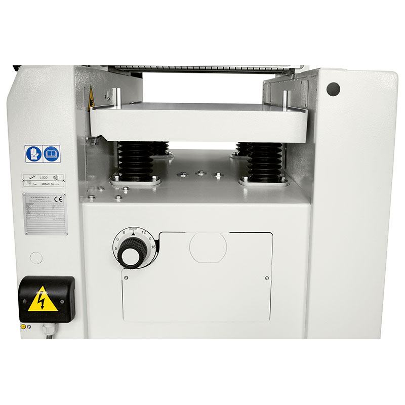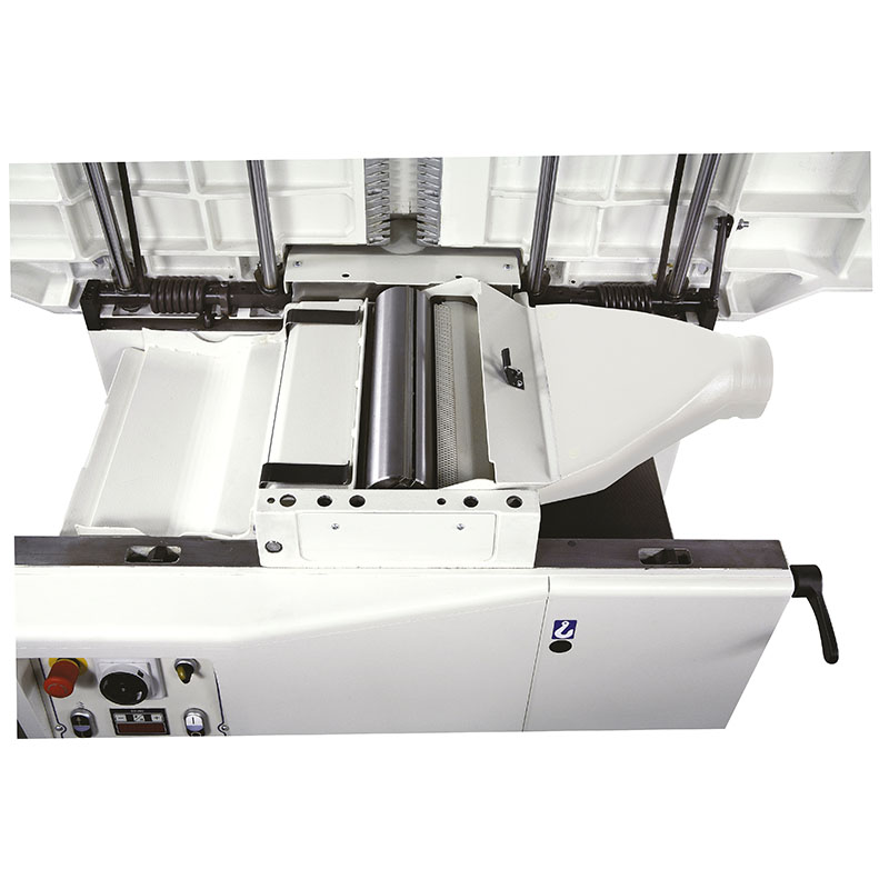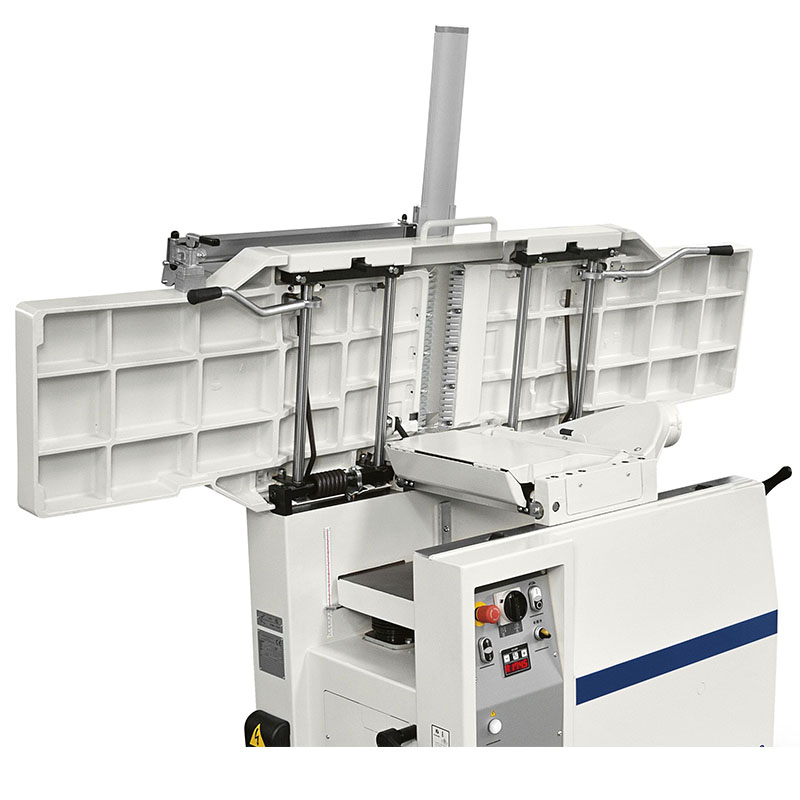 The pressure of the thicknesser feed roller to be adjusted according to the type of wood being machined. The infeed roller has a helicoidal profile to guarantee firm and constant work piece feed, while the outfeed roller in sandblasted steel, maintains the perfect post-processing finishing. For maximum long lasting stability the cast iron thicknessing table is supported on 4 spindles with trapezoidal threads.