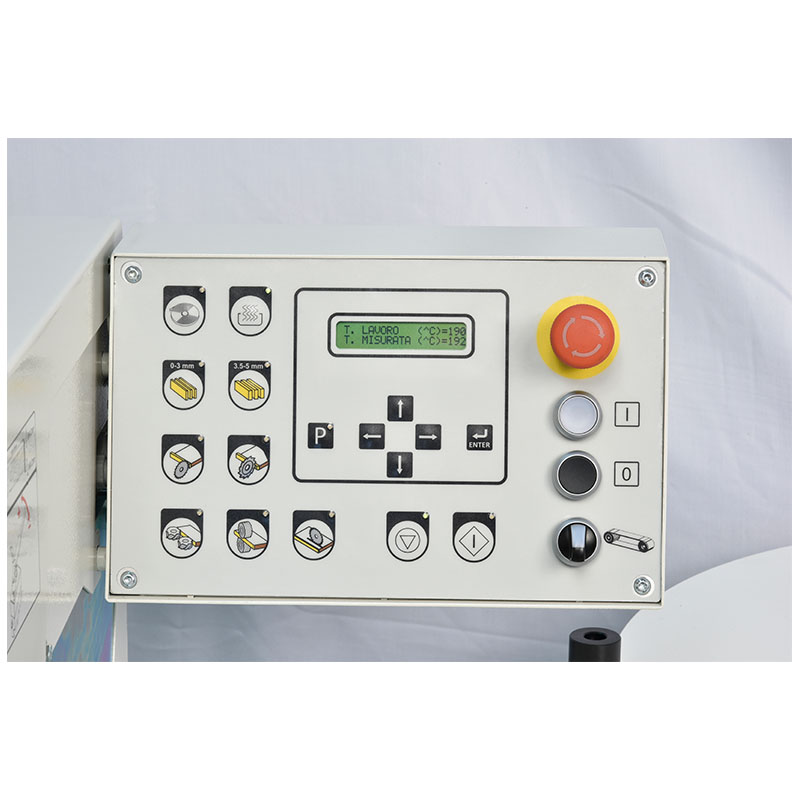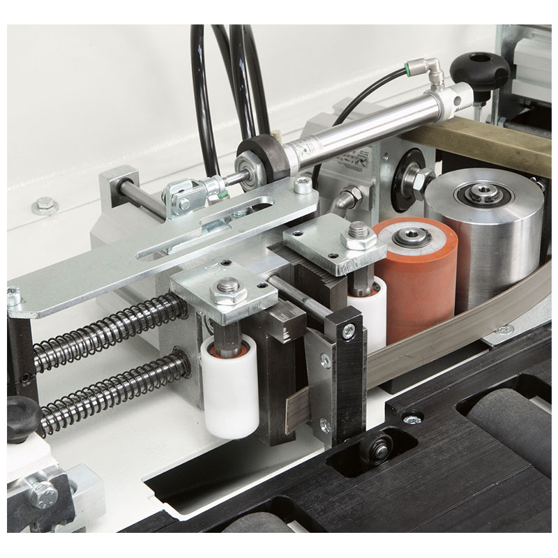 The glue is heated rapidly and evenly with automatic temperature lowering after a temporary halt in production to avoid burning the adhesive. Two rollers press the edge banding evenly and efficiently on to the panel edge. The glue spreading roller with heating elements inside provides a uniform glue spread the optimal working temperature.