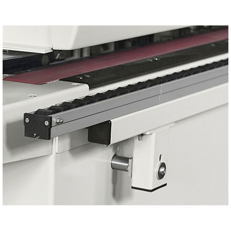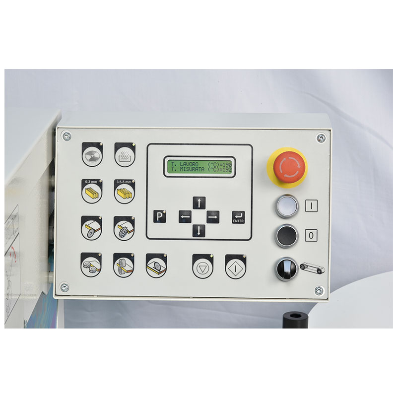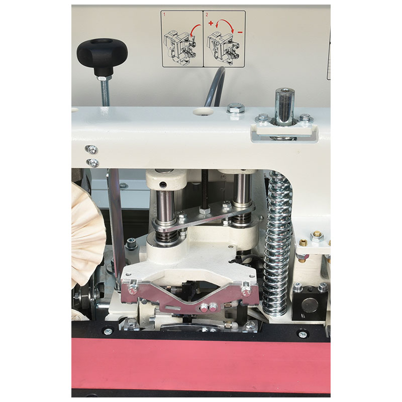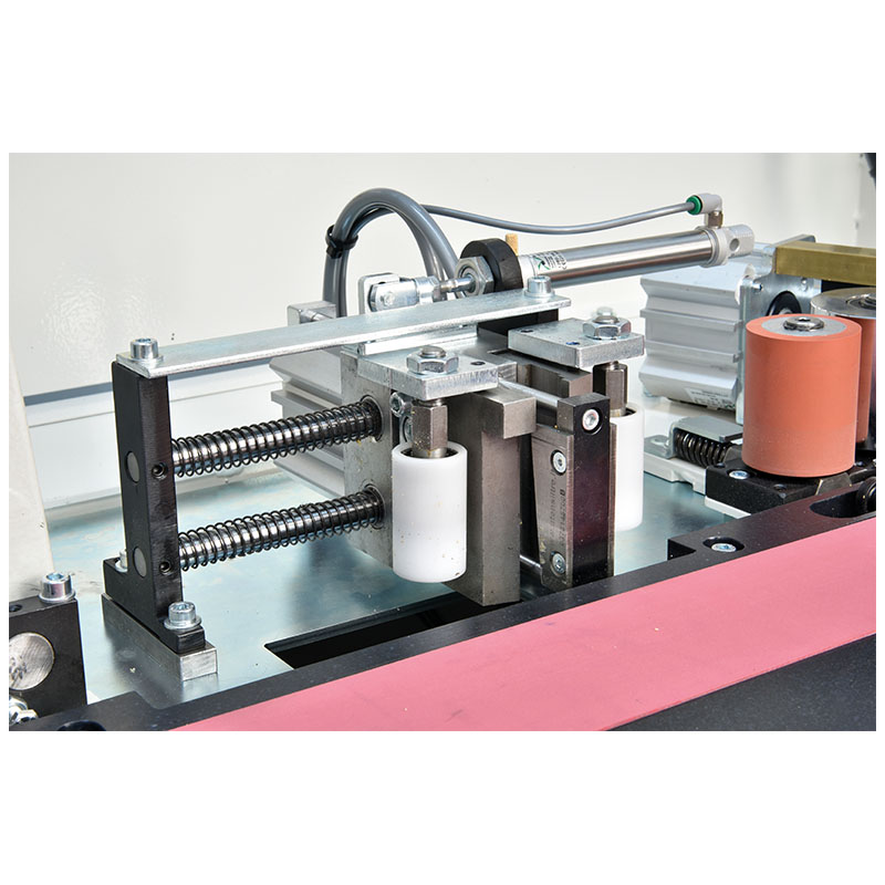 The glue is heated rapidly and evenly with automatic temperature lowering after a temporary halt in production to avoid burning the adhesive. Two rollers press the edge banding evenly and efficiently on to the panel edge. The glue spreading roller with heating elements inside provides a uniform glue spread the optimal working temperature.