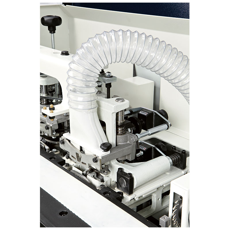 The machine units operate with slide copying pads to align perfectly to the work piece. Cutters are designed for straight or radius trimming of any type of edge, whether it is thick or thin, made of PVC, ABS, melamine, laminate or wood. The edge thickness is easily set by means of two numerical readouts.