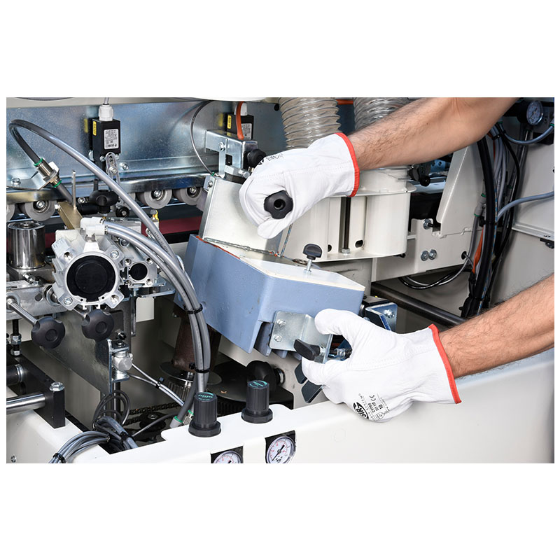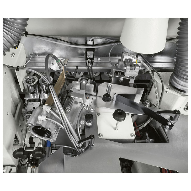 The pre-milling unit (ME 40T and ME 40TR models only) removes any imperfections on the panel edge caused by sawing before the glue and edging is applied operation ensuring a clean, crisp bond between the panel and edging. Pre-milling also useful if the panels have been stored prior to edging.