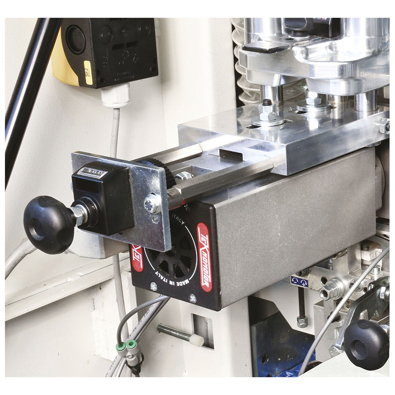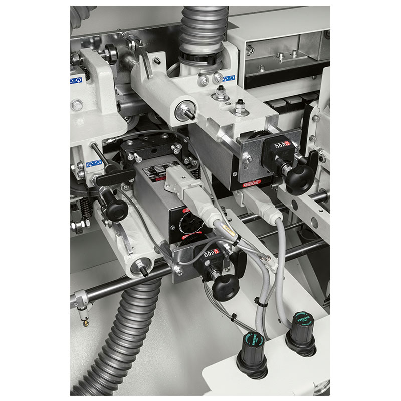 The machine units operate with slide copying pads to align perfectly to the work piece. Cutters are designed for straight or radius trimming of any type of edge, whether it is thick or thin, made of PVC, ABS, melamine, laminate or wood. The edge thickness is easily set by means of two numerical readouts.
