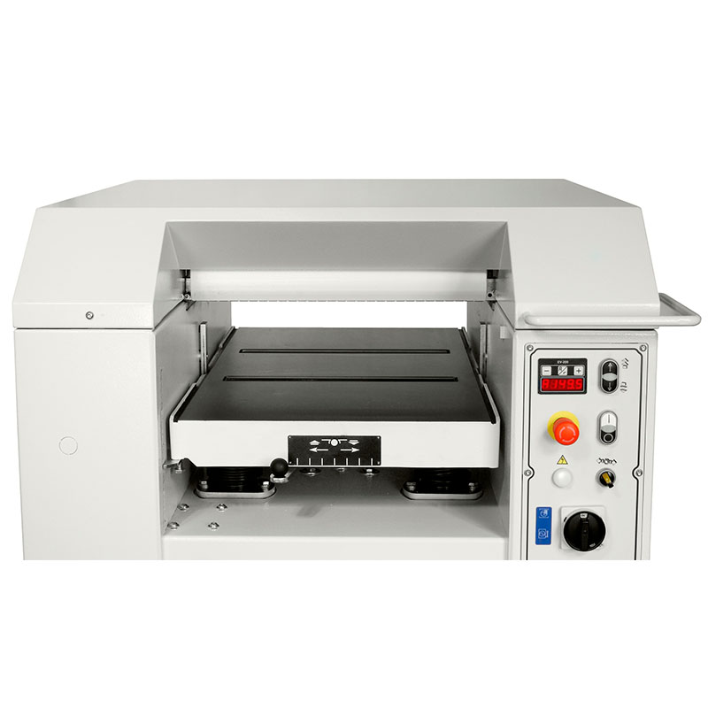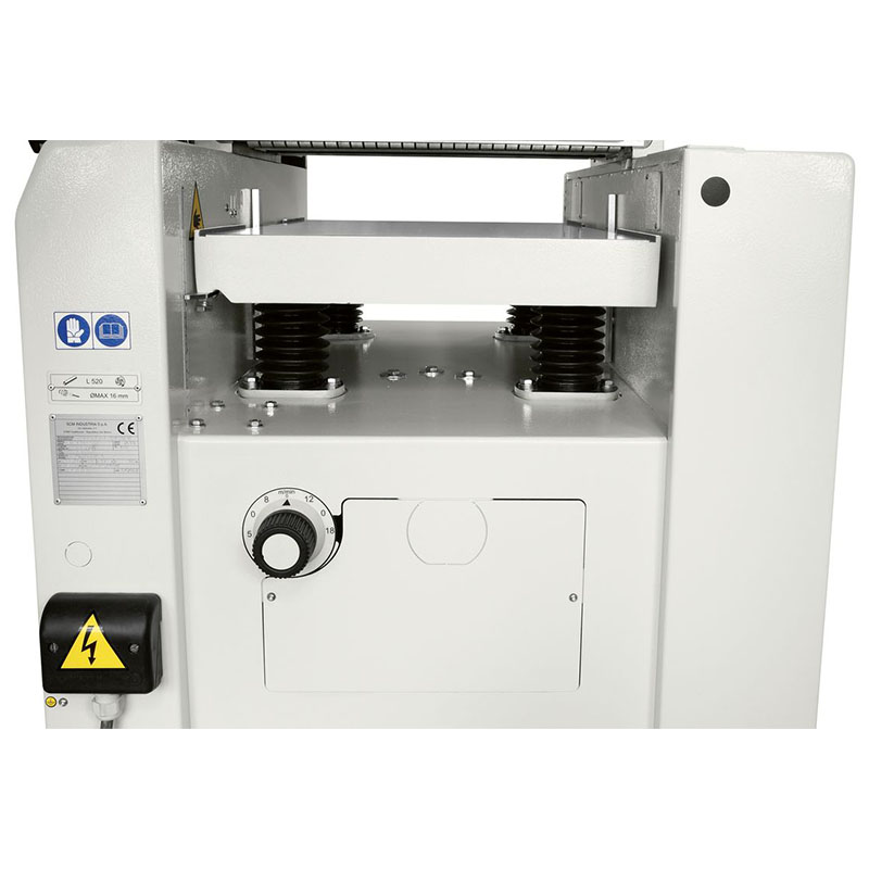 The pressure of the thicknesser feed roller to be adjusted according to the type of wood being machined. For maximum long lasting stability the cast iron thicknessing table is supported on 4 spindles with trapezoidal threads.