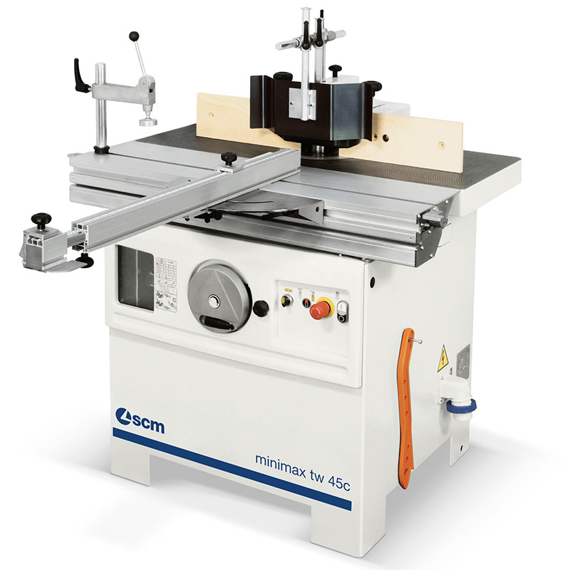 The SCM Minimax T 45C spindle moulder is equipped with an 1000 mm anodized aluminium sliding table, complete with a mitre fence, 2 flip stops and eccentric clamp. Spindle tilt from 90 – 45° ...