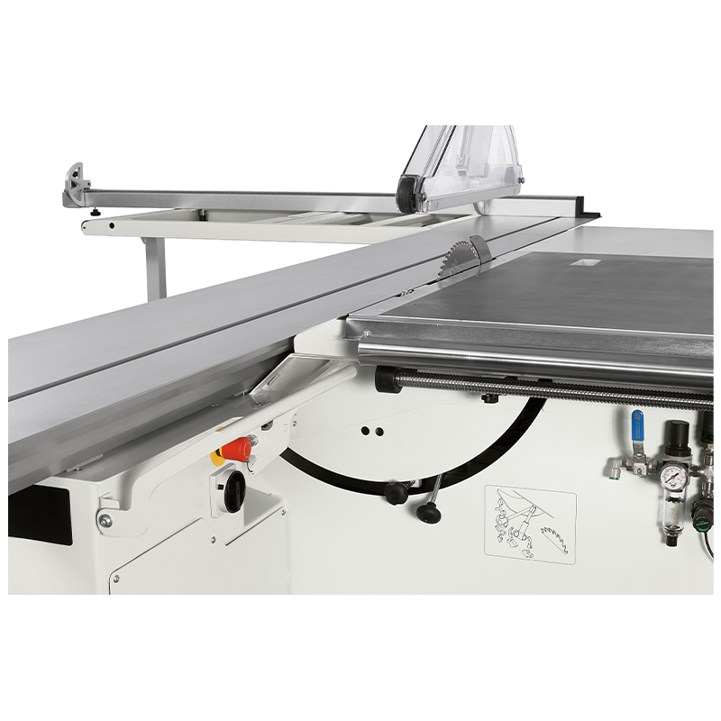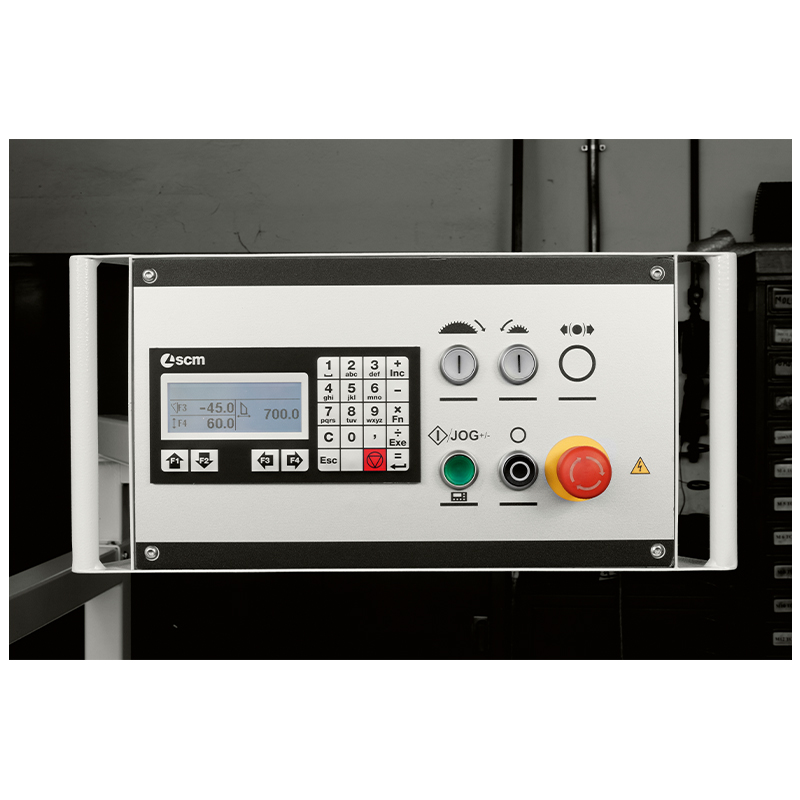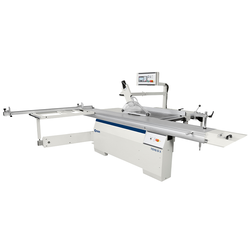 The SCM Nova SI X is driven by a 7 kW main motor and independent 0.9 kW scoring saw motor. The standard sliding table length is 2600 mm with a 1270 mm rip fence. See the optional equipment for increasing the capacity to 3200mm for 10’ sheet processing.