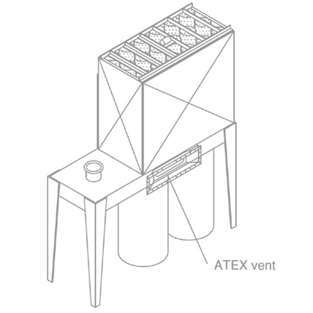 This unit is a free standing multifilter for either inside or outside factory use and suitable for efficiently filtering sofwood, MDF, hardwood and sanding waste (only with closed sided option). The filter sleeves are manufactured from the highest quality terylene needlefelt of 10 ounce weight, which are shaken automatically each time the unit is switched off. The metal filter components are manufactured from pre-formed galvanised sheet and hole punched for bolted assembly. The unit is supplied with a control panel containing a direct on line starter for the main fan and a timer for the cleaning shaker motor. Explosion vent area 0.162m² compliant with ATEX regulations. On closed sided and weatherproof models the polybag is contained within a free placed metal bin.